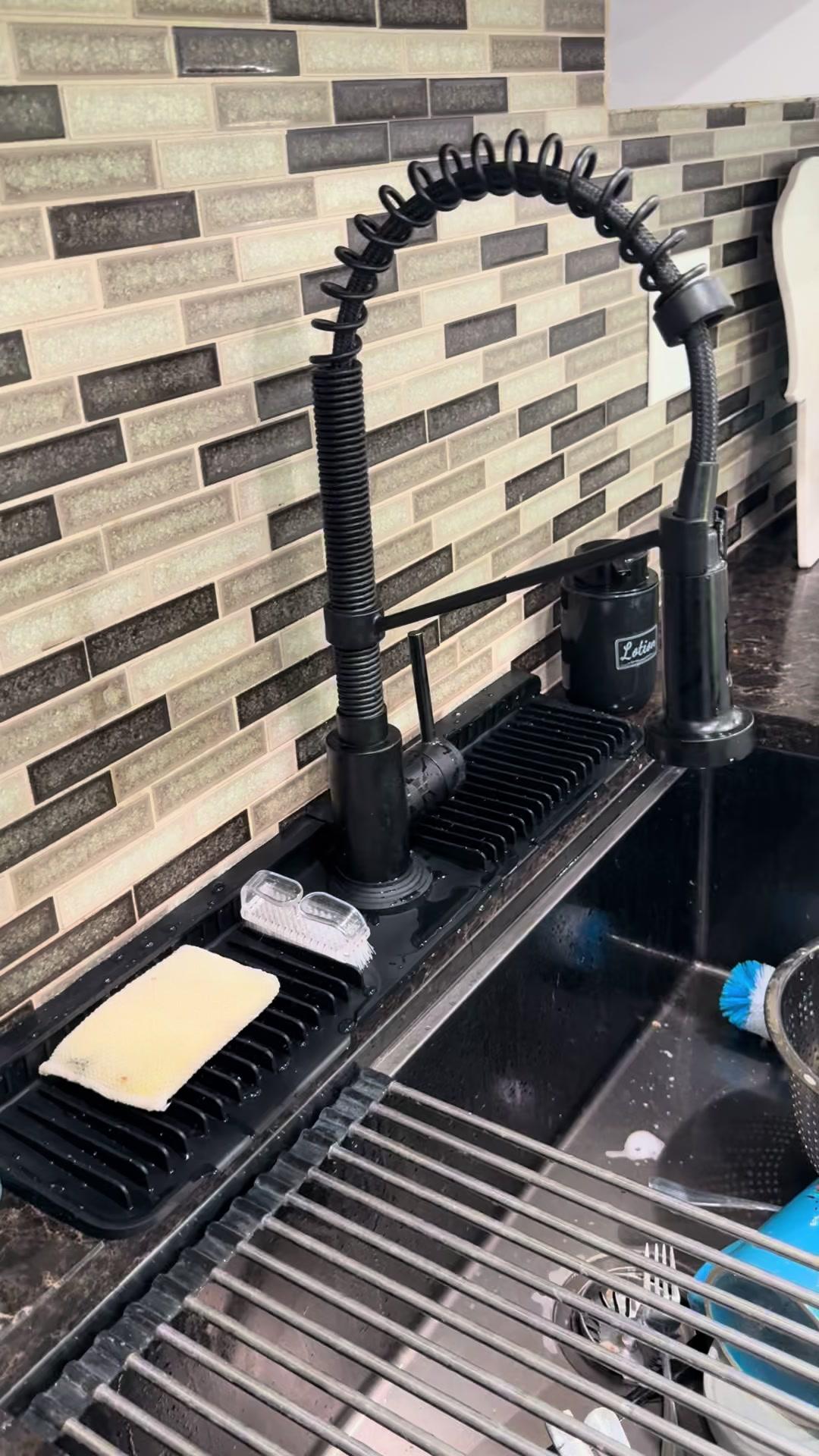 The newly upgraded Sink Splash Guard 24-inch length fits perfectly into most sinks, the latest 5° slope design auto-drains keep countertops clean and free of standing water, the adaptive adjustable center hole diameter for 0.65-2.5" faucets, and the side-fold design eliminates the need to worry about gaps between walls and kitchen mats